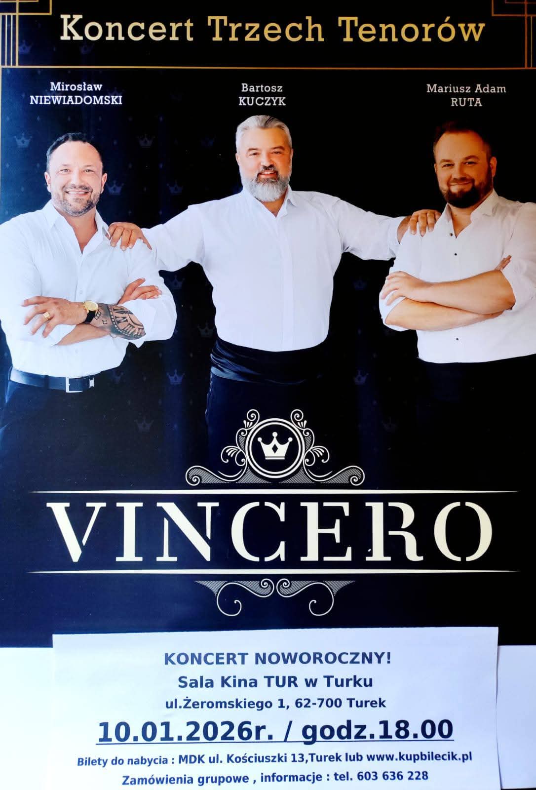 Koncert Trzech Tenorów VINCIERO odbędzie się 10 stycznia 2026 r. o godz. 18:00 w Sali Kina TUR w Turku przy ul. Żeromskiego 1, gdzie Mirosław Niewiadomski, Bartosz Kuczyk i Mariusz Adam Ruta zaprezentują noworoczny koncert pełen operowych i musicalowych emocji, a bilety dostępne są w MDK w Turku oraz online.