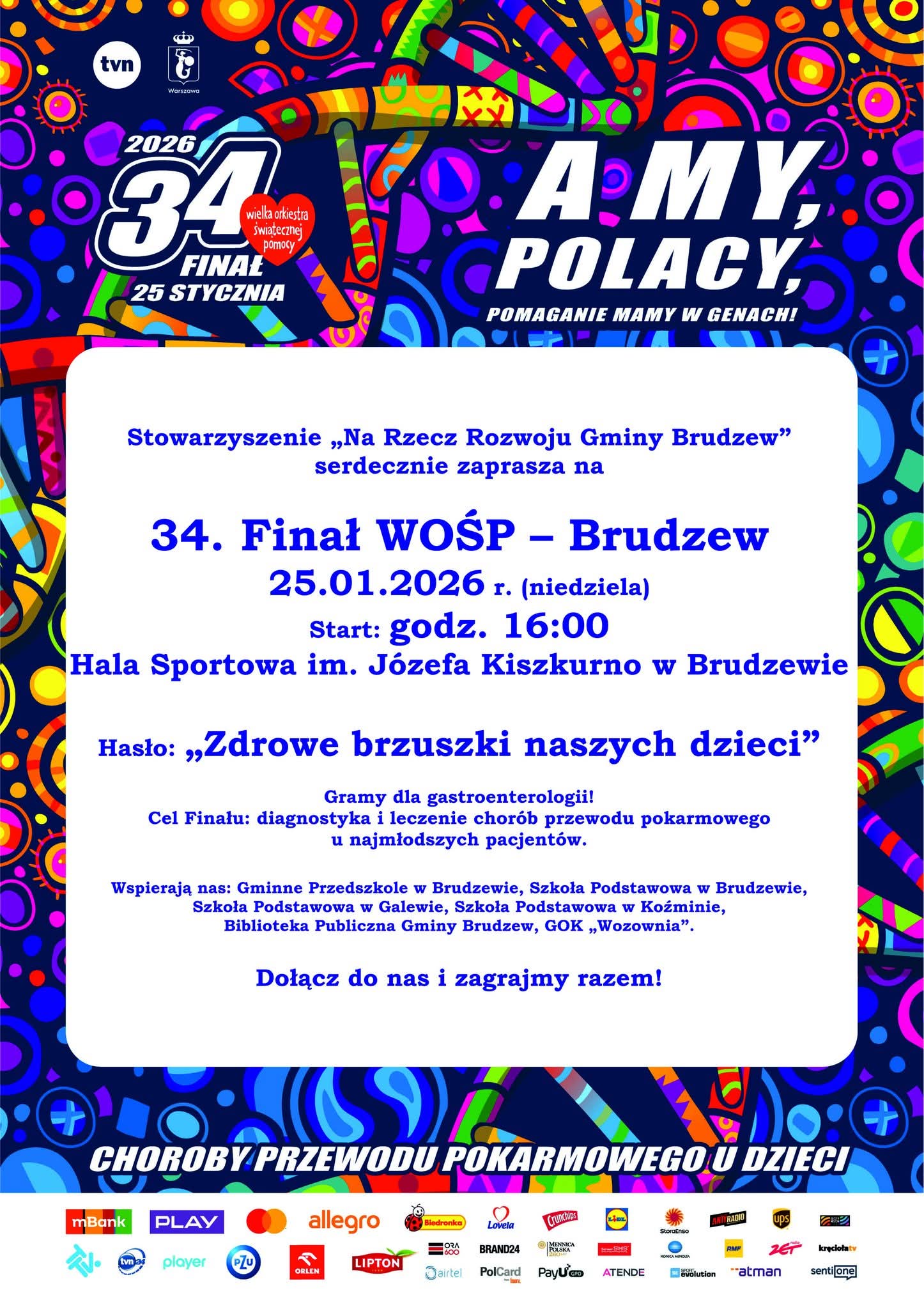 34. Finał Wielkiej Orkiestry Świątecznej Pomocy w Brudzewie to wspólne granie dla zdrowia najmłodszych pod hasłem „Zdrowe brzuszki naszych dzieci”, podczas którego mieszkańcy i goście spotkają się, by wspierać diagnostykę i leczenie chorób przewodu pokarmowego u dzieci, a wydarzenie odbędzie się 25 stycznia 2026 r. o godz. 16:00 w Hali Sportowej im. Józefa Kiszkurno w Brudzewie.