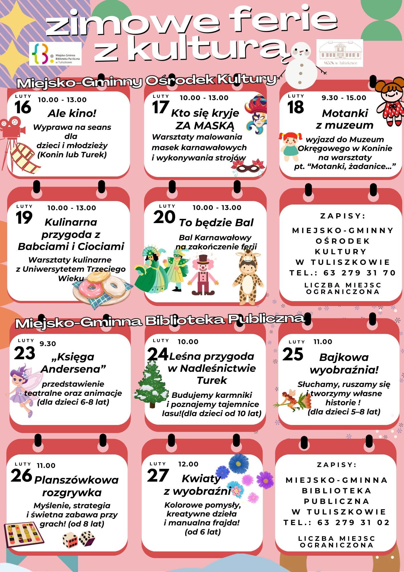 Półkolonie Artystyczne 2026 – Zimowe Ferie z Kulturą to tydzień pełen sztuki, zabawy i kreatywnych przygód dla dzieci i młodzieży, który odbędzie się od 16 do 20 lutego 2026 roku, w godzinach 10.00–13.00, w Miejsko-Gminnym Ośrodku Kultury w Tuliszkowie, gdzie uczestnicy wezmą udział w wyjeździe do kina, warsztatach plastycznych i kulinarnych, wycieczce do muzeum, spotkaniach międzypokoleniowych oraz wielkim balu karnawałowym, a dodatkowo będą mogli rozwijać swoje pasje podczas popołudniowych warsztatów teatralnych.