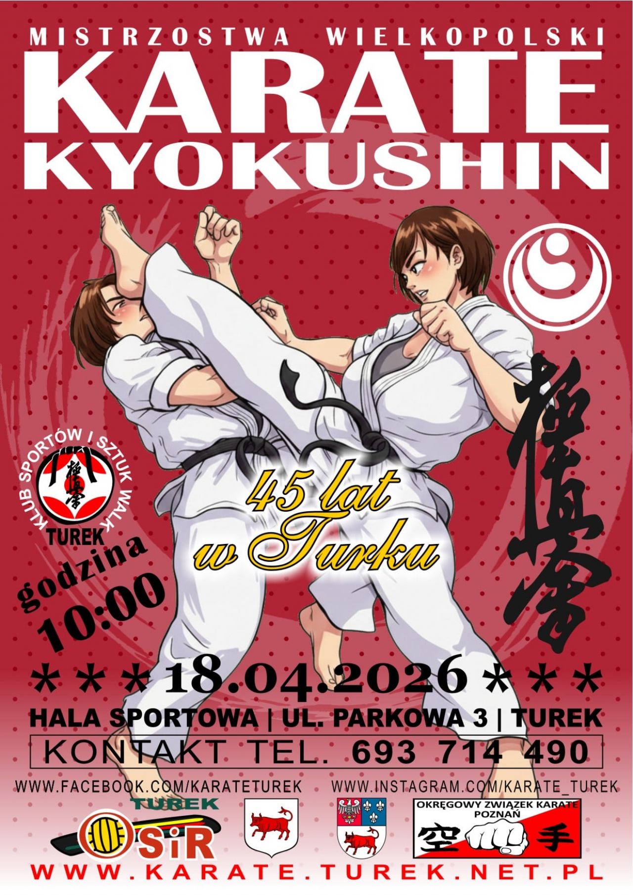 Mistrzostwa Wielkopolski Karate Kyokushin to wyjątkowe sportowe wydarzenie organizowane z okazji 45-lecia karate w Turku, które zgromadzi zawodników i pasjonatów tej dyscypliny z całego regionu i odbędzie się 18 kwietnia 2026 roku o godz. 10.00 w Hali Sportowej w Turku przy ul. Parkowej 3, oferując widowiskowe walki, sportowe emocje i rywalizację na najwyższym poziomie.