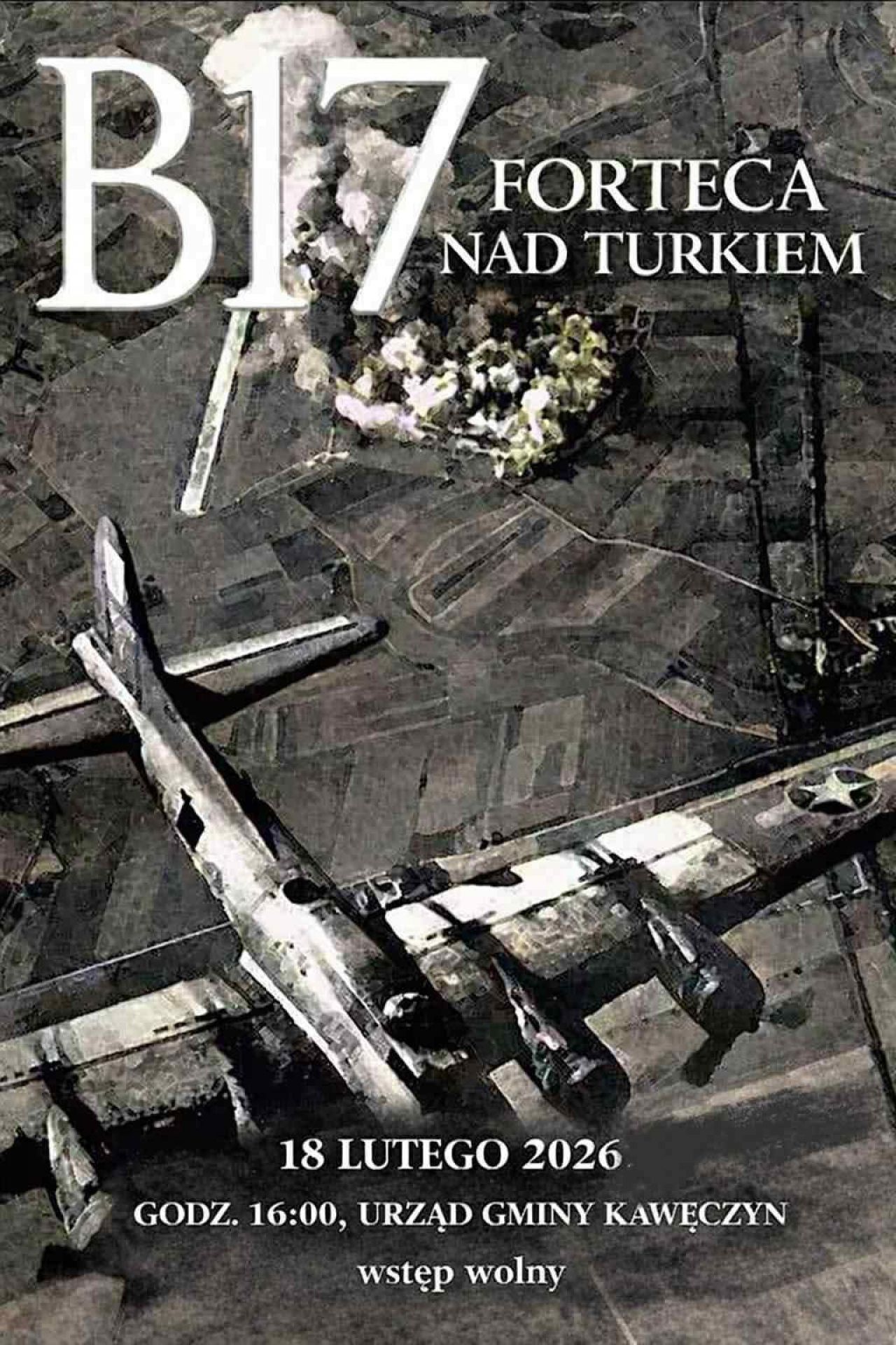 „B-17 – Forteca nad Turkiem” to historyczna prelekcja poświęcona dramatycznym wydarzeniom z czasów II wojny światowej, podczas której Bogdan Chmielecki przybliży okoliczności zestrzelenia amerykańskiego bombowca w naszym regionie, a spotkanie odbędzie się 18 lutego 2026 roku, o godzinie 16.00, w sali posiedzeń Urzędu Gminy w Kawęczynie, z wstępem wolnym dla wszystkich miłośników historii i lokalnych dziejów.