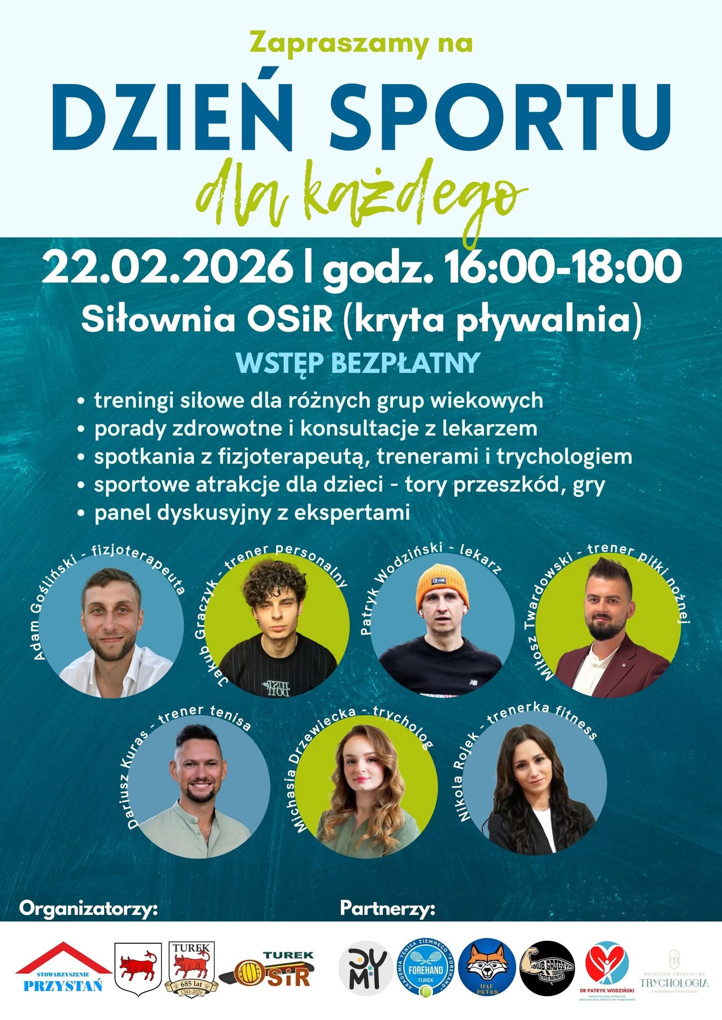 Dzień Sportu dla Każdego to otwarte wydarzenie pełne aktywności i wiedzy, które odbędzie się 22 lutego 2026 roku, w godzinach 16:00–18:00, w siłowni OSiR w budynku krytej pływalni w Turku, podczas którego uczestnicy będą mogli wziąć udział w treningach siłowych dla różnych grup wiekowych, skorzystać z porad zdrowotnych i konsultacji lekarskich, porozmawiać z fizjoterapeutą, trenerami i trychologiem, zapewnić dzieciom sportowe atrakcje w formie gier i torów przeszkód oraz wysłuchać panelu dyskusyjnego z ekspertami, a wszystko to w ramach bezpłatnego wstępu i idei aktywności dostępnej dla każdego.