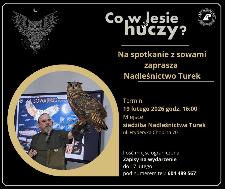 Co w lesie huczy? – Spotkanie z sowami w Nadleśnictwie Turek to wyjątkowe wydarzenie, podczas którego będzie można zajrzeć w tajemniczy świat nocnych mieszkańców lasu i dowiedzieć się, dlaczego sowy latają bezszelestnie, jak widzą w ciemności oraz co naprawdę oznacza ich charakterystyczne „huczenie”, a także wziąć udział w spotkaniu „oko w oko” z sową i wspólnym ognisku z kiełbaskami; wydarzenie odbędzie się 19 lutego 2026 r. (czwartek) o godzinie 16:00 w siedzibie Nadleśnictwa Turek, ul. Fryderyka Chopina 70, a ze względu na ograniczoną liczbę miejsc obowiązują zapisy do 17 lutego pod numerem telefonu 604 489 567.