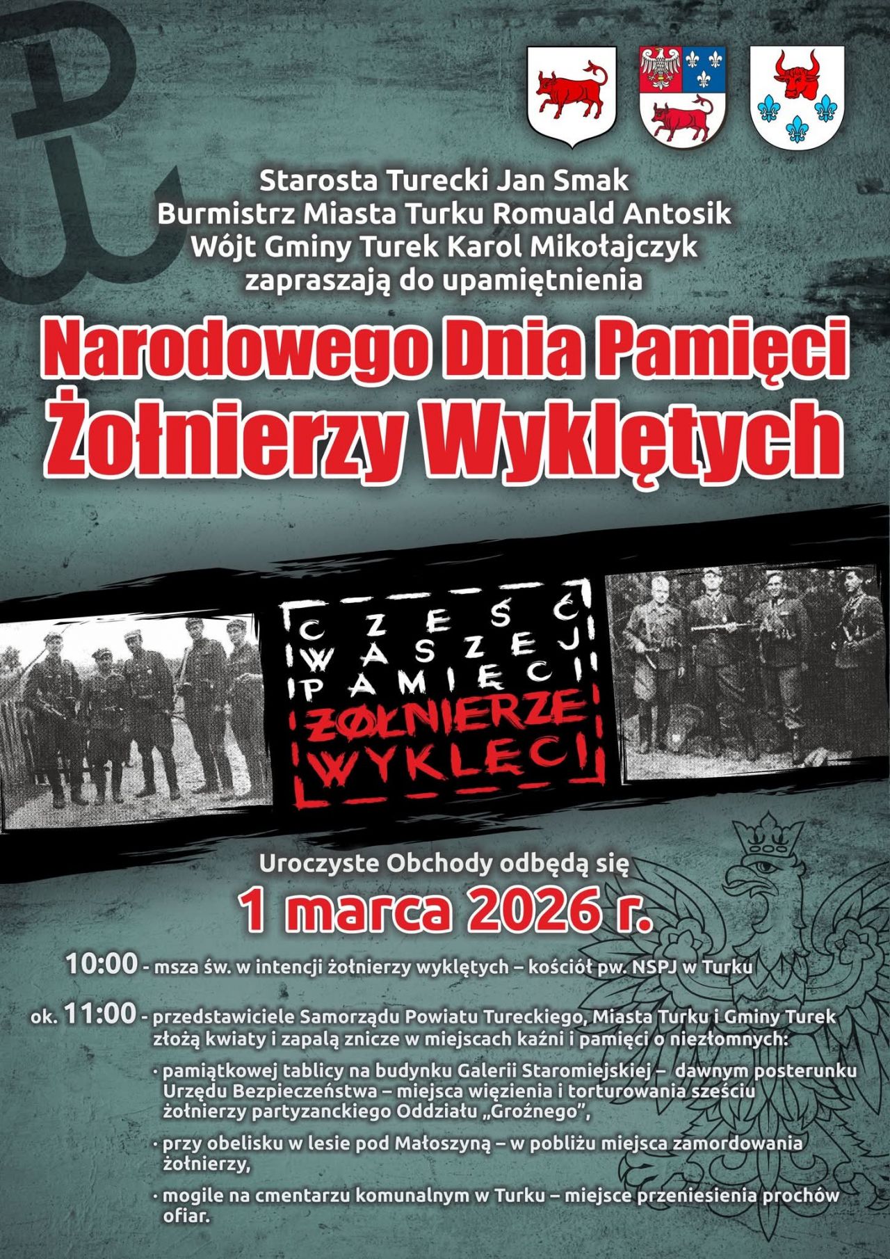 Narodowy Dzień Pamięci Żołnierzy Wyklętych Starosta Turecki, Burmistrz Miasta Turku oraz Wójt Gminy Turek zapraszają do wspólnego upamiętnienia bohaterów podczas uroczystych obchodów, które odbędą się 1 marca 2026 r., a wydarzenia rozpoczną się o godzinie 10:00 mszą świętą w kościele pw. NSPJ w Turku, po czym około godziny 11:00 przedstawiciele samorządów złożą kwiaty i zapalą znicze w miejscach pamięci, w tym przy pamiątkowej tablicy na budynku Galerii Staromiejskiej – dawnym posterunku Urzędu Bezpieczeństwa, przy obelisku w lesie pod Małoszyną oraz na mogile na cmentarzu komunalnym w Turku, oddając hołd Żołnierzom Wyklętym i przypominając o ich poświęceniu dla Ojczyzny.