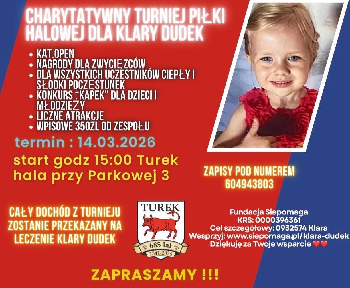Charytatywny Turniej Piłki Halowej dla Klary Dudek Już 14 marca 2026 r. o godzinie 15:00 w hali przy ul. Parkowej 3 w Turku odbędzie się turniej w kategorii open, podczas którego przewidziano nagrody dla zwycięzców, ciepły i słodki poczęstunek dla wszystkich uczestników, konkurs „Kapeć” dla dzieci i młodzieży oraz liczne atrakcje, a wpisowe wynosi 350 złotych od zespołu. Cały dochód z wydarzenia zostanie przeznaczony na leczenie Klary Dudek, a zapisy prowadzone są pod numerem telefonu 604 943 803, dlatego organizatorzy zachęcają do udziału i wspólnego wsparcia szczytnego celu.