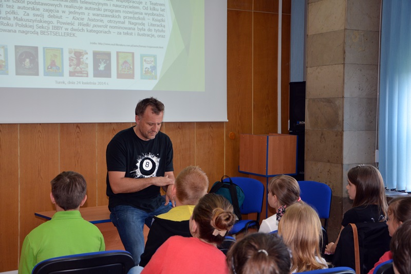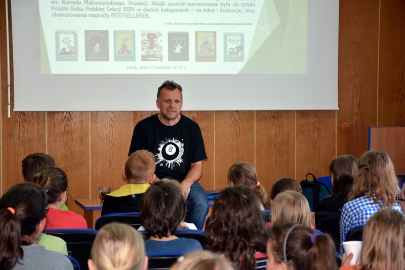 Atrakcją dla finalistów konkursu oraz ich opiekunów, a także grupy uczniów SP 1 w Turku było spotkanie z Tomaszem Trojanowskim – autorem książek dla dzieci i młodzieży, m.in. Kocie historie, za którą w 1998 r. otrzymał Nagrodę Literacką im. Kornela Makuszyńskiego, czy Wielki powrót, uhonorowanej nagrodą BESTSELLERKA i podwójną nominacją (tekst oraz ilustracje) do tytułu Książka Roku Polskiej Sekcji IBBY w 2007 r. Ponadto napisał utwory: Julka i koty, Kocie historie – nowe przygody, Włochacz i obca cywilizacja, Dziobaś i inni, Uciekinierzy, Kosmiczne komplikacje oraz Misja Lolka Skarpetczaka i słuchowiska Polskiego Radia zatytułowane Odlot. Wykształcenie pedagogiczne wykorzystuje w pracy z dziećmi w szkole, realizując stworzony przez siebie program rozwijania wyobraźni, a także w przedszkolu, gdzie prowadzi swój autorski program zajęć Książki z mojej półki. Pracuje też jako dziennikarz telewizyjny i współpracuje z Teatrem Polskiego Radia.