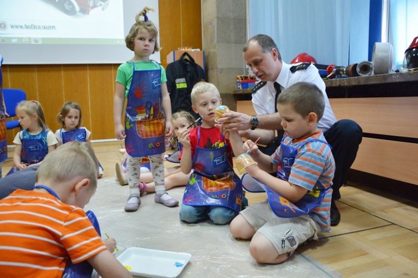 Z kolej jednym z najbardziej efektownych działań zakończyło się spotkanie dzieci z „Bajkowego Przedszkola” ze strażakiem – Andrzejem Drzewieckim. Maluchy, oprócz tego, że mogły przymierzyć czapkę i hełmy strażackie, obejrzeć prawdziwy wąż oraz prądnicę - tzw. sikawkę, zbudowały z pomocą strażaka kartonowy wóz strażacki. Było też projektowanie podkowy oraz „pieniążka na szczęście”, jak również rozsypanka literowa, zabawy z imionami i literkami.