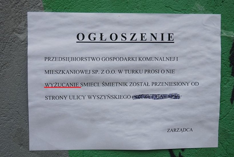 Każdemu z nas czasami może trafić się mały błąd ortograficzny. Na niedomiar złego, bywa i tak, że ów błąd może przyczytać całkiem spora grupa ludzi, wśród których znajdzie się osoba wrażliwa na piękno i poprawność naszego rodzimego języka. Tak jest w przypadku pisma wystosowanego do mieszkańców bloków leżących przy ul. Władysława Broniewskiego przez PGKiM.