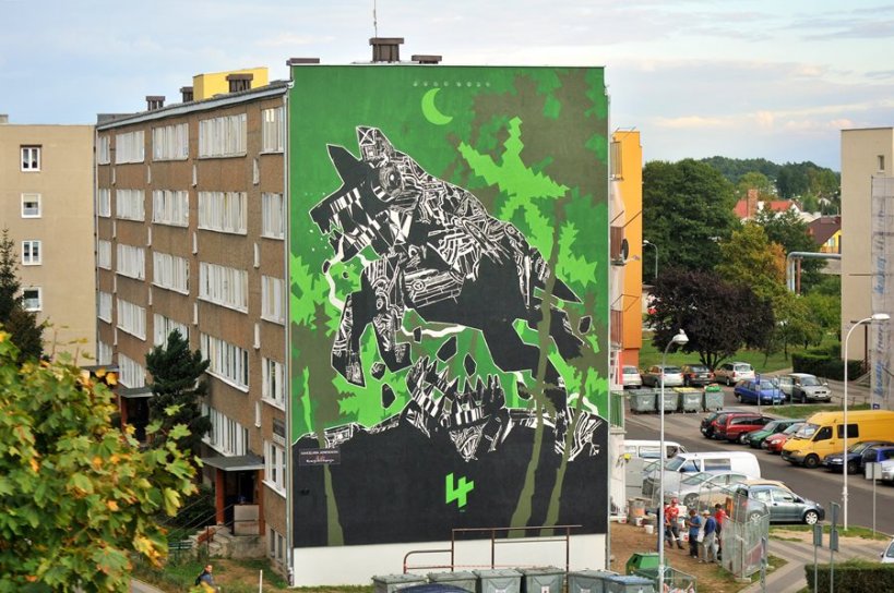 Autorem dzieła jest Mariusz Waras, doświadczony grafik i projektant. Ten pochodzący z Gdyni artysta streetartowy znany jest przede wszystkim z projektu m-city, czyli murali realizowanych na ścianach budynków w przestrzeniach miejskich. Mural ukazuje wilka lub psa przeskakującego nad sidłami. Obraz powstał szybko, gdyż wykonywany został metodą przygotowanych wcześniej szablonów.