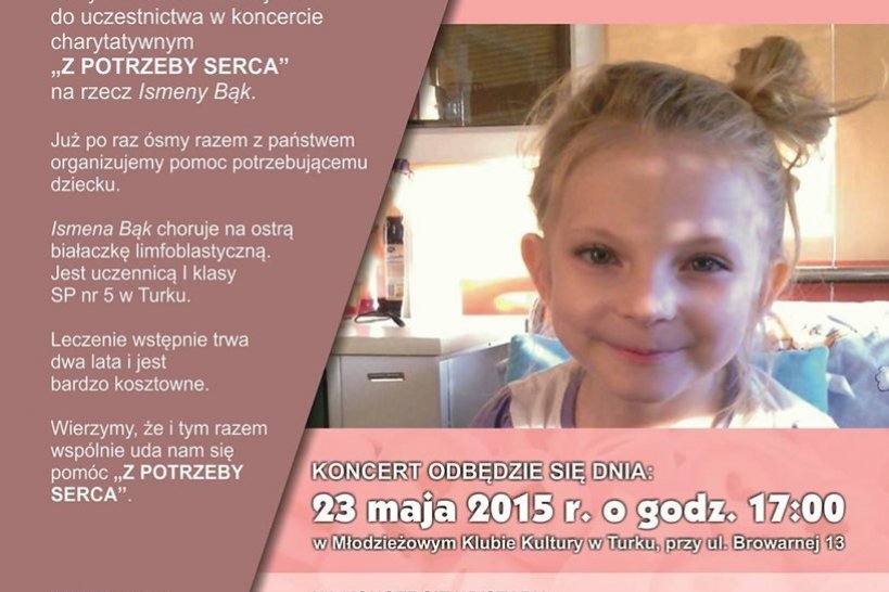 Gwoli przypomnienia – mieszkańcy powiatu tureckiego mieli już kilkukrotnie okazję wesprzeć Ismenkę. Warto wspomnieć że w lutym w MDK w Turku miał miejsce walentynkowy koncert zadedykowany Ismenie Bąk, a w marcu w Zespole Szkół w Kowalach Pańskich odbył się koncert charytatywny „Kiedy śmieje się dziecko, śmieje się cały świat”, w którego organizację zaangażowali się nauczyciele, uczniowie i absolwenci szkoły oraz Rada Rodziców. Z kolei w kwietniu podczas koncert charytatywnego "Z serca dla serca" dla małej turkowianki zaśpiewała m.in. Magda Femme. Osoby, które przegapiły te wydarzenia – lub chcące po raz kolejny okazać szczodrość swego serca – mogą pomóc dziewczynce w sobotni wieczór.
