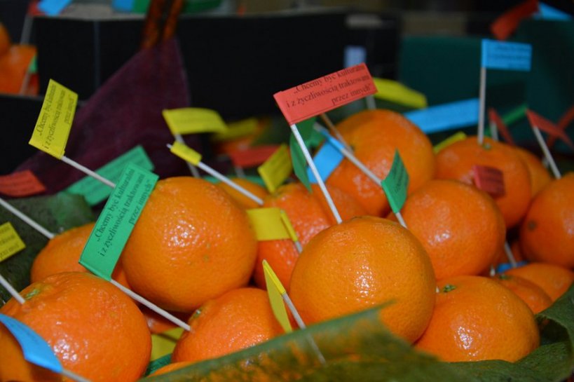 Gimnazjalistki z Samorządu Uczniowskiego odwiedziły każdą klasę, informując o akcji i częstując pysznymi mandarynkami. Owoce zakupiono ze środków przekazanych od sponsora. Przedsięwzięcie to było już kolejnym działaniem w ramach programu „Bezpieczna plus”.