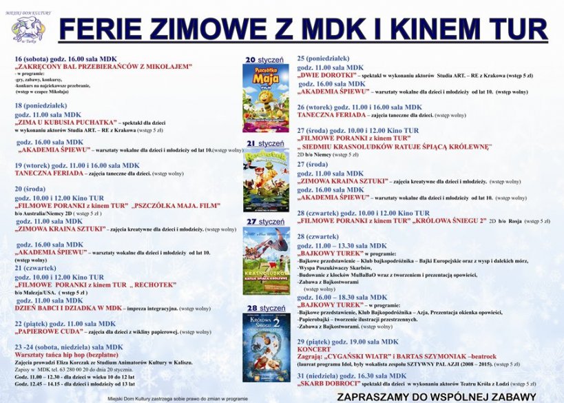 Uczniowie wracają dziś ze szkół radośni i zadowoleni, albowiem wiedzą, że szkolne obowiązki na pewien czas odejdą, a w zamian nadejdzie dobra zabawa. Na czas ferii Miejski Dom Kultury w Turku i Kino Tur zapewnią wiele ciekawych zajęć dla dzieci i młodzieży.