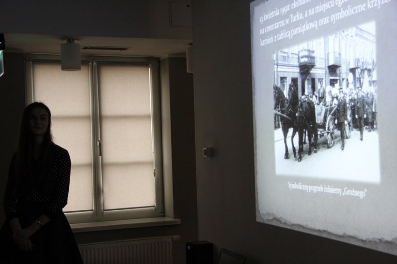 Gimnazjalistki, korzystając z uprzejmości pracowników Muzeum Miasta Turek zorganizowały w jego mediatece dwie prelekcje: 12 kwietnia dla wszystkich zainteresowanych, a dwa dni później dla młodzieży z Gimnazjum nr 1 i Ochotniczego Hufca Pracy . W sumie w spotkaniach wzięło udział ponad 50 osób w przedziale wiekowym od 3 do 70 lat. Zgromadzeni poznali cel udziału uczennic w projekcie oraz informacje jakie udało się im zdobyć. Wiedzę na temat Żołnierzy Wyklętych działających na naszych terenach uzupełniła swoją prezentacją pani Karolina Wójtowicz -historyk i pracownik muzeum. Na spotkania została zaproszona pani Anna Musialska – jedyny dziś świadek egzekucji, jednak ze względów zdrowotnych nie mogła w nich wziąć udziału. Nie mniej, jej naoczną relację zgromadzeni poznali dzięki filmowi z wywiadem jaki udzieliła pracownikom IPN.