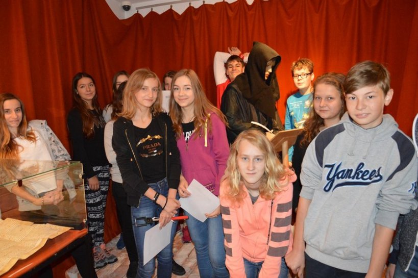 Gimnazjaliści nie tylko zapoznali się z techniką tworzenia papieru czerpanego, ale osobiście wzięli udział w jego produkcji. Następnie, wykorzystując ręczne maszyny, przystąpili do drukowania. Na warsztat poszło dzieło naszego patrona „O obrotach sfer niebieskich”. Trzeba było włożyć trochę wysiłku, by uruchomić „drukarkę”. Potem na krótko odwiedzili mnicha pełniącego rolę skryby, by w końcu trafić do… szkoły. Jedna z muzealnych sal została przekształcona w dawną klasę. Gimnazjaliści zasiedli w ławkach z otworem na kałamarz i wzięli udział w lekcji kaligrafii. Dodatkowym utrudnieniem było wykorzystanie piór gęsich i tuszu. Brudne ręce nie popsuły humorów uczniom, którzy świetnie się przy tym bawili.