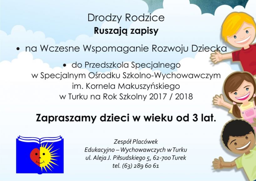 Drodzy Rodzice. Ruszają zapisy na Wczesne Wspomaganie Rozwoju Dziecka do Przedszkola Specjalnego w Specjalnym Ośrodku Szkolno-Wychowawczym im. Kornela Makuszyńskiego w Turku na rok szkolny 2017/2018. Zapraszamy dzieci w wieku od 3 lat. Więcej informacji pod nr tel. 63 289 60 61.