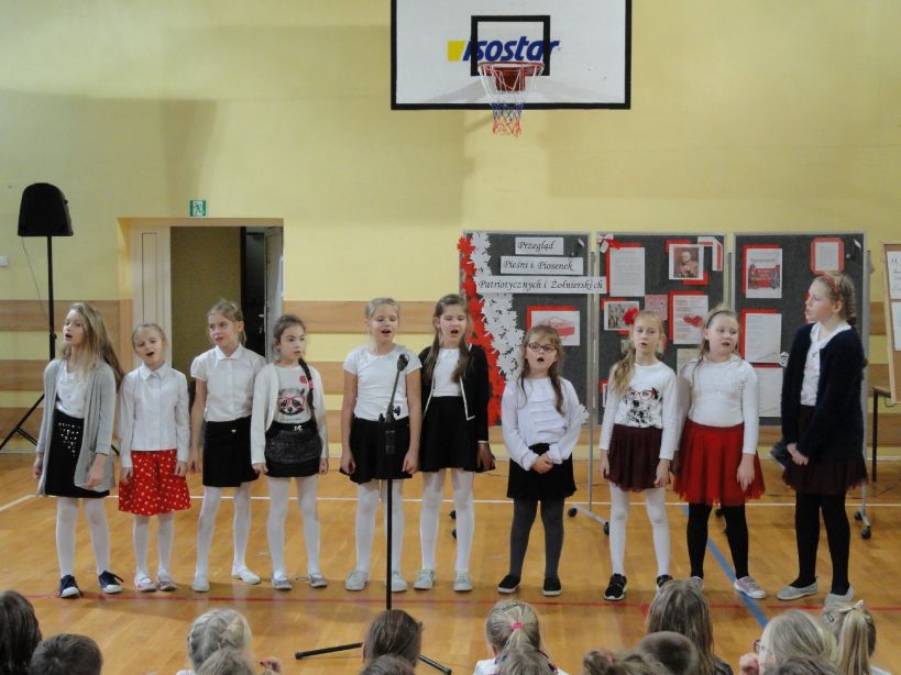 Nie zabrakło pieśni powszechnie znanych przez małych i dużych czyli ,,Dziś do Ciebie przyjść nie mogę”, ,,Wojenko, wojenko” czy ,,Pierwsza brygada”. Muzyczne spotkanie zakończył występ chóru szkolnego oraz pieśń wykonana na trąbce. Każdej pieśni towarzyszyła podniosła atmosfera, wszyscy zgodnie twierdzili, że takie uroczystości potrafią wyzwalać przeróżne pozytywne emocje i trzeba je koniecznie powtarzać.