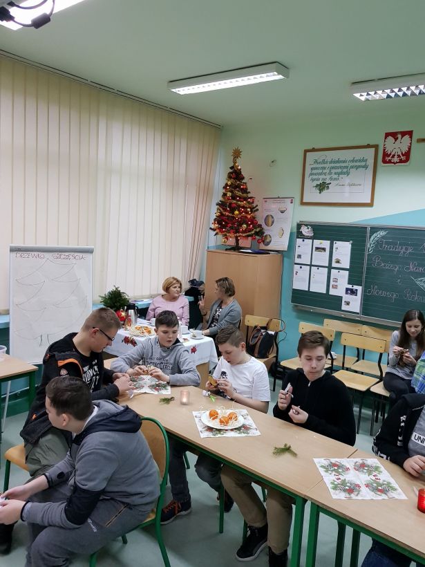 Gimnazjaliści przygotowali prezentacje multimedialne o tradycjach świętowania Bożego Narodzenia i Nowego Roku w różnych krajach. Uczniowie wykonali prezentacje na temat świąt w krajach dla nas, Polaków, bardzo egzotycznych np. RPA, Singapurze, Australii. Projekty zaprezentowały uczennice kl. II b - Natalia i Klaudia. Podczas spotkania zaproszeni goście losowali pytania dotyczące prezentacji, z za poprawne odpowiedzi (były tylko takie) otrzymywali słodkie upominki. Miłą niespodzianką dla uczestników spotkania był także świąteczny prezent - uczniowie i nauczyciele obdarowani zostali cukierkami, przy których znaleźli wesołą wróżbę na nadchodzący Nowy Rok.