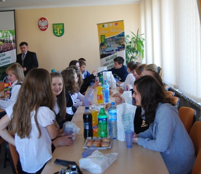 Zaproszeni goście swoją wizytę rozpoczęli od spotkania z Wójtem Gminy Malanów – Gerardem Krzeszewskim, który w Urzędzie Gminy serdecznie powitał wszystkie dzieci i ich opiekunów. Młodzi goście z Ukrainy byli zainteresowani funkcjonowaniem urzędu oraz tym co się dzieje w naszej gminie zadawając Panu Wójtowi wiele pytań, na które dzieci uzyskały wyczerpujące odpowiedzi. Następnie goście wręczyli Panu Wójtowi pamiątkowy album w postaci książki z pięknymi widokami Ukrainy. Również Wójt podziękował za przybycie i obdarował przybyłych gości drobnymi upominkami. Spotkanie przebiegło w miłej i sympatycznej atmosferze, po którym zostało zrobione wspólne pamiątkowe zdjęcie.