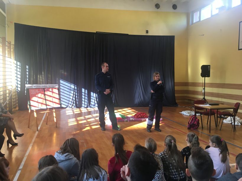 Do szkolnej akcji propagującej bezpieczeństwo w Internecie włączyła się również policja. Młodszy aspirant pani Katarzyna Kotońska oraz młodszy aspirant pan Robert Rojak przeprowadzili prelekcję dla uczniów na temat zagrożeń występujących w wirtualnym świecie oraz konsekwencji rozpowszechniania słów nienawiści, dyskryminacji i przemocy. Uczniowie dowiedzieli się, że negatywne zachowanie w Internecie niesie ze sobą konsekwencje prawne.