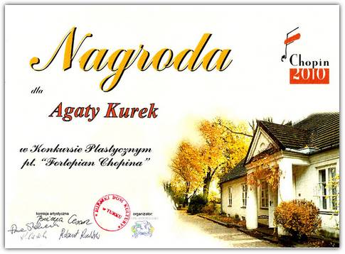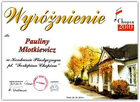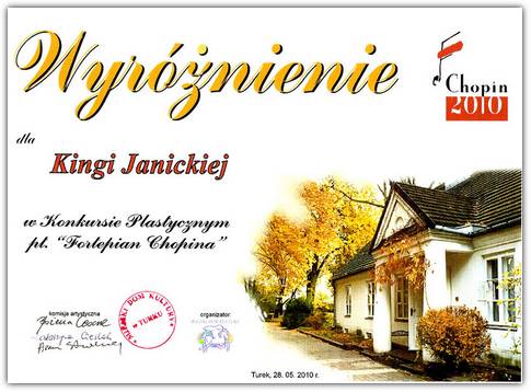 Uczennice klas IV ZSP w Dobrej zdobyły w powiatowym konkursie plastycznym pt. „Fortepian Chopina" następujące osiągnięcia: NAGRODA dla Agaty Kurek oraz WYRÓŻNIENIA dla Kingi Janickiej oraz Pauliny Młotkiewicz. Konkurs został zorganizowany przez Miejski Dom Kultury w Turku.