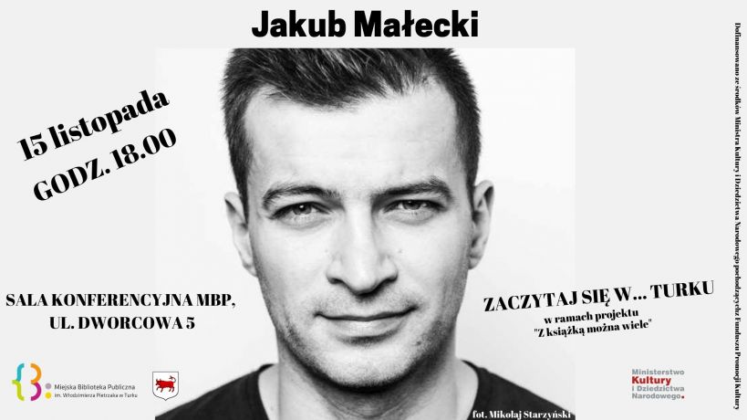 na spotkanie z Jakubem Małeckim zapraszamy 15 listopada o godz. 18.00 do Sali Konferencyjnej Miejskiej Biblioteki Publicznej w Turku (ul. Dworcowa 13). Dofinansowano ze środków Ministra Kultury i Dziedzictwa Narodowego pochodzących z Funduszu Promocji Kultury.