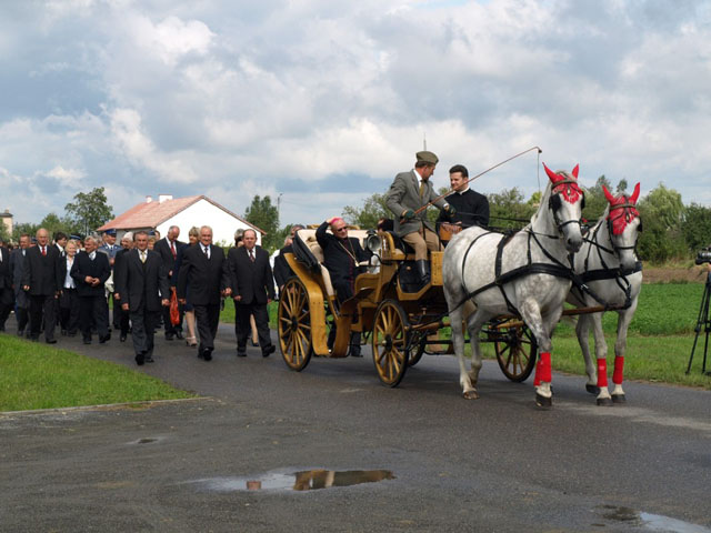 Po zakończeniu Mszy św. przy dźwiękach orkiestry strażackiej z Tokar wszyscy udali się no do nowego budynku szkoły, gdzie rozpoczęła się część oficjalna. Całą drogę Jego Ekscelencja wraz z księdzem proboszczem Antonim Janickim, Dyrektorką Szkoły - Panią Ewą Wojtczak, oraz Wójtem Gminy Kawęczyn - Janem Nowakiem przejechał dwukonną bryczką. Po przecięciu wstęgi i wejściu do nowego nowej szkoły - na prośbę Pani Dyrektor - Ksiądz Biskup poświęcił budynek oraz poszczególne izby lekcyjne. Następnie nastąpiły okolicznościowe przemówienia oraz wręczanie upominków - zazwyczaj o charakterze pomocy dydaktycznych. Następnym punktem programu były występy uczniów Szkoły. Całość uroczystości zakończył symboliczny kieliszek szampana oraz tort, którego zaszczyt dzielenia przypadł w udziale pani Dyrektor, Ewie Wojtczak.