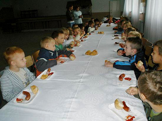 Z powodu niesprzyjającej aury spotkanie odbyło się w sali OSP w Grąbkowie, gdzie czekało na dzieci wiele atrakcji. Co prawda nie było tradycyjnego ogniska, ale za to była pyszna kiełbaska z grilla, pączki oraz to co dzieci lubią najbardziej - cukierki.
