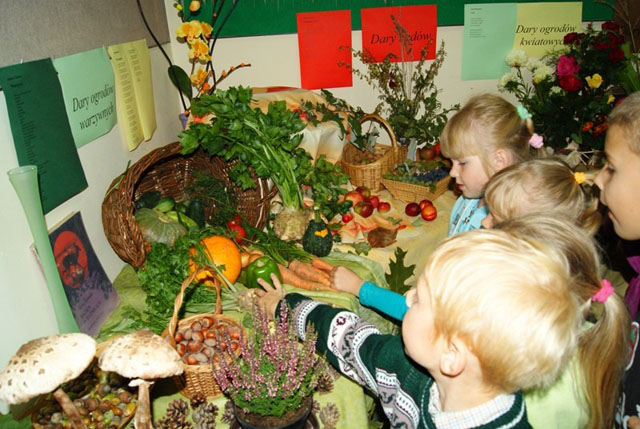 Dary jesieni to wystawa przygotowana z myślą o najmłodszych, tj. oddziałów przedszkolnych i klas I - III, ale także wśród nieco starszych uczniów cieszyła się ona ogromnym powodzeniem.