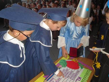 Uczennice klasy czwartej wprowadziły „pierwszaków" w świat czterech krain, w których kandydaci na uczniów wykazywali się nowymi wiadomościami i umiejętnościami w zakresie muzyki, pracowitości, mądrości i miłości. Nad całością czuwała dobra wróżka, która pomogła dzieciom przebyć wszystkie krainy. W krainie muzyki wykazały się pięknym śpiewem i bezbłędną znajomością tekstu wielu piosenek. W nagrodę otrzymały herb – klucz wiolinowy.