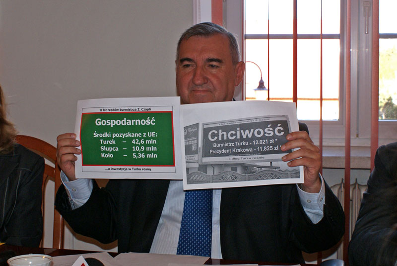 Kilka dni temu, w strategicznych punktach na mapie naszego miasta, pojawiły się bilbordy o treść krytykującej osiem lat kadencji burmistrza Zdzisława Czapli oraz rządzącą koalicję PiS-TS. Pierwsza tablica - „Turek zadłużony na 30 milionów” - przedstawia informacje na temat wysokości zadłużenia miasta, druga - „Chciwość” - mówi o wysokości 13 pensji burmistrza Czapli i 13 pensji Prezydenta Miasta Krakowa za miniony rok.