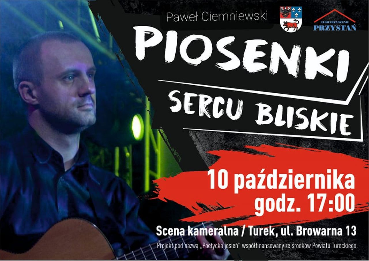 Paweł Ciemniewski, kojarzony zapewne lokalnej społeczności z repertuarem piosenki turystycznej i poezji śpiewanej, współpracą z Pawłem Grabarą i zespołem KMT, tym razem zaprezentuje się solo. Wyjątkowa atmosfera panująca podczas wydarzeń w sali Przystani, wyjątkowy wykonawca, jesień za oknem – to argumenty przemawiające za tym, by w niedzielny wieczór wybrać się na ten klimatyczny koncert. Początek o godzinie 17.00. Wstęp bezpłatny.