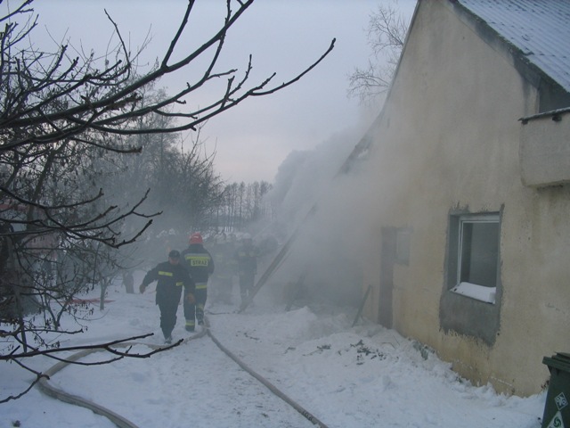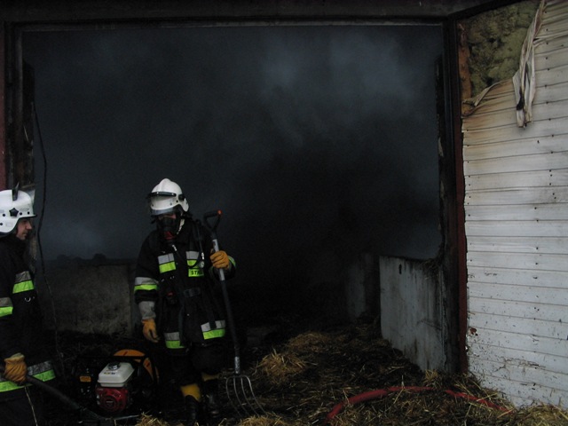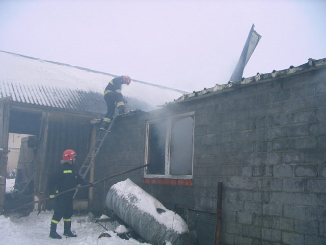 Przybyli na miejsce pierwsi strażacy zastali pożar obejmujący swym zasięgiem wnętrze budynku inwentarskiego oraz całe pokrycie dachowe wykonane z płyty obornickiej. Rozpoczęto działania gaśnicze. Wodę podawano do środka budynku poprzez wybite okna, podawano również wodę na dach oraz w obronie na sąsiednią stodołę. Równocześnie strażacy wraz z właścicielem obiektu uwolnili buhaja, który był uwiązany przy drzwiach obiektu. Ze względu na bardzo duże zadymienie wewnątrz obiektu strażacy pracowali w aparatach ochrony dróg oddechowych.