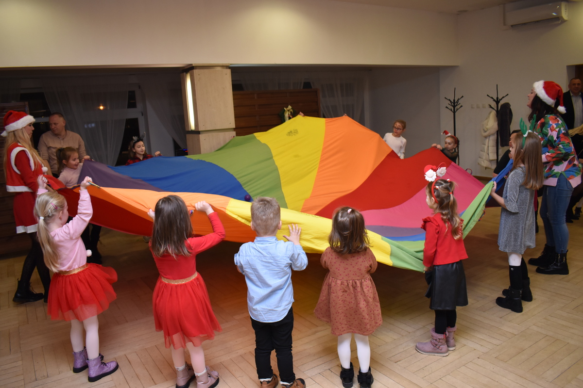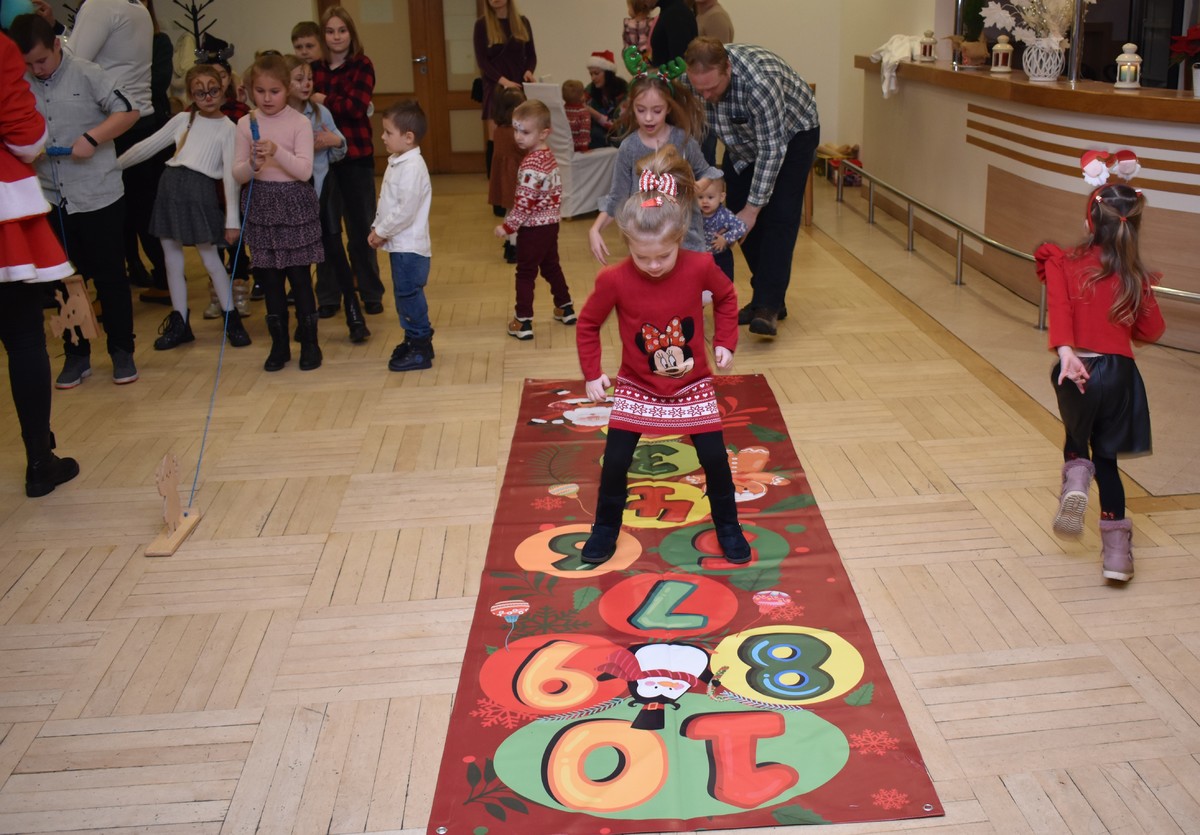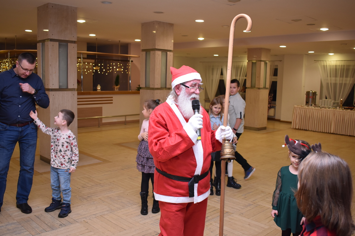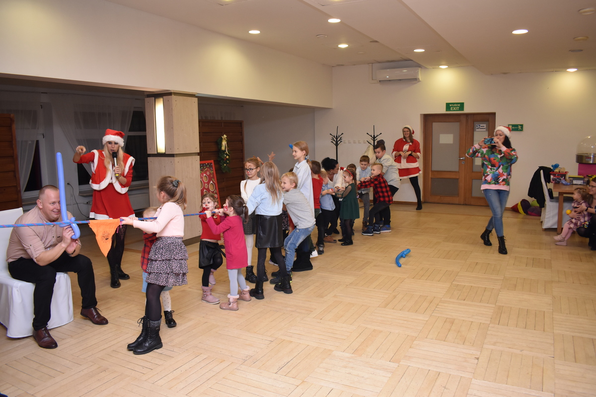 Następnie na sali pojawił się oczekiwany przez najmłodszych Święty Mikołaj, który wręczył wszystkim dzieciom paczki ze słodyczami. W dalszej części pojawiły się animatorki, które zaprosiły dzieci do wspólnej zabawy i udziału w licznych konkursach.
