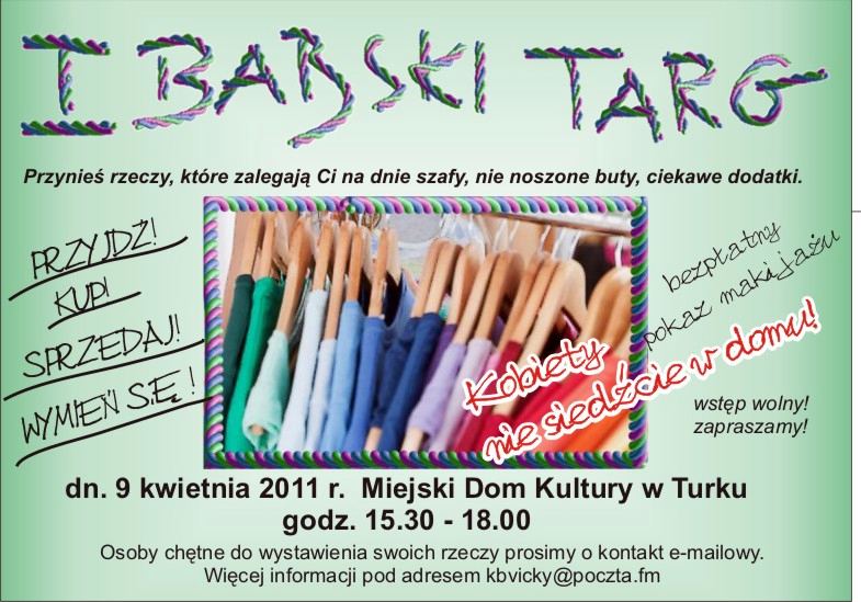 Impreza odbędzie się 9 kwietnia, w sobotę w Miejskim Domu Kultury w Turku. Start I Babskiego Targu przewidziano na godz. 15.30. Osoby chętne do prezentowania swoich rzeczy proszone są o kontakt pod adresem kbvicky@poczta.fm Wpisowe dla osób wystawiających wynosi jedynie 10 zł. Dla pozostałych osób wstęp wolny.