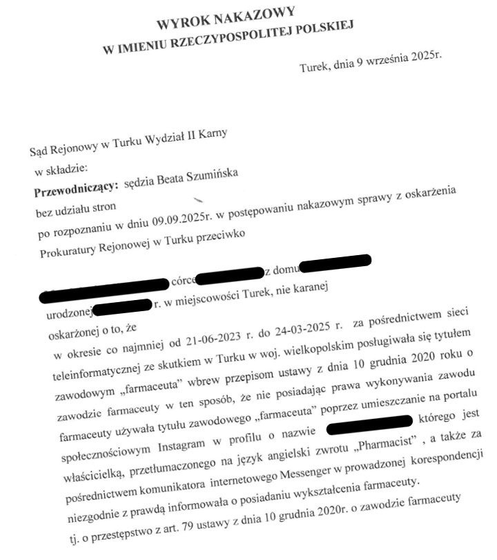 Sąd Rejonowy w Turku skazał kobietę, która podszywała się pod farmaceutkę w mediach społecznościowych. Choć nigdy nie miała uprawnień zawodowych, posługiwała się tytułem „farmaceuta” na Instagramie, wprowadzając w błąd obserwujących. Sprawę nagłośniła Wielkopolska Okręgowa Izba Aptekarska, a sąd wymierzył jej karę 3000 zł grzywny.