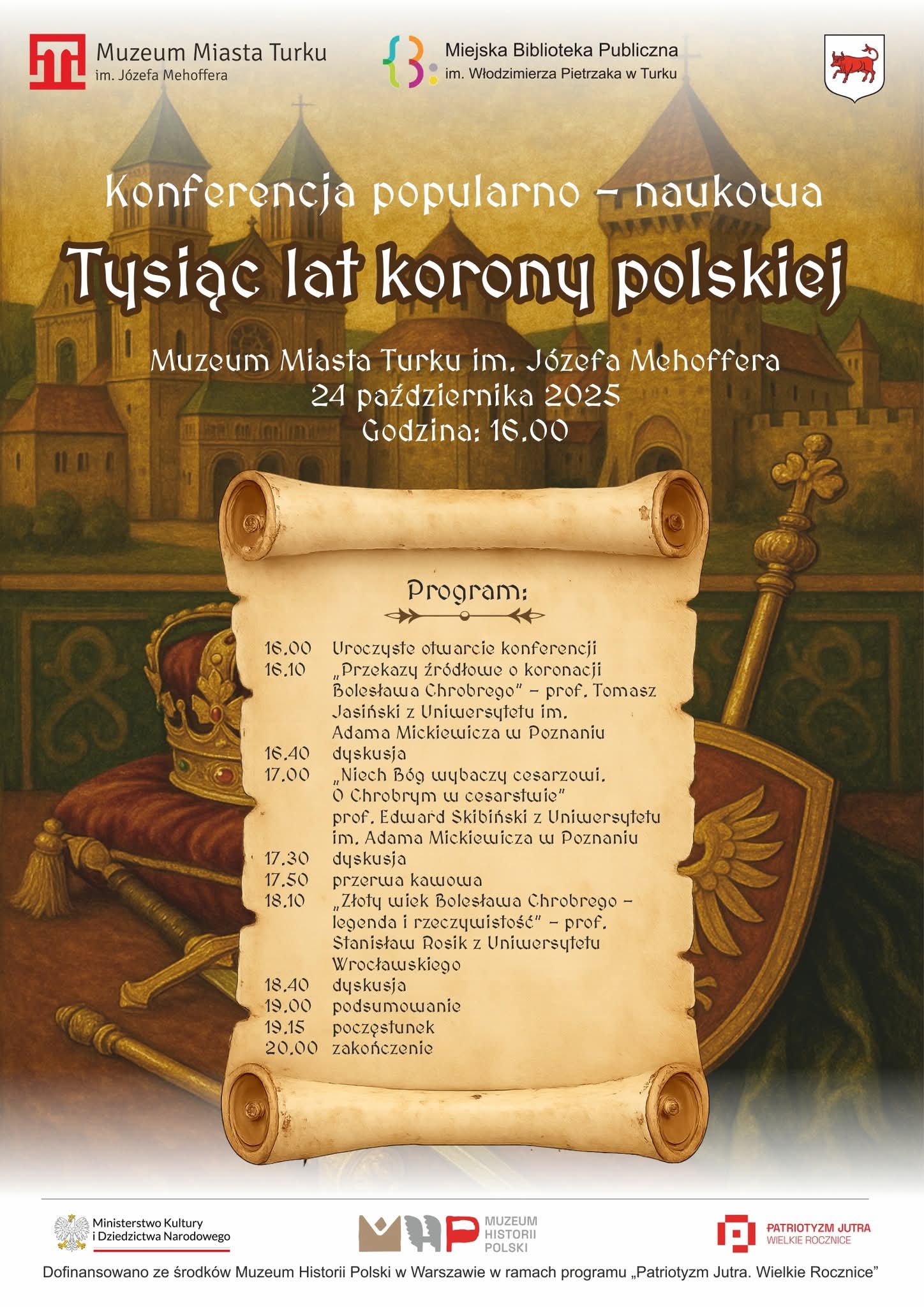 Już 24 października o godzinie 16.00 Muzeum Miasta Turku im. Józefa Mehoffera serdecznie zaprasza wszystkich zainteresowanych historią Polski na konferencję zatytułowaną Tysiąc lat korony polskiej. W programie wystąpienia znanych poznańskich i wrocławskich historyków, pracowników naukowych uniwersytetów – mediewistów, związane z koronacją Bolesława Chrobrego na pierwszego króla Polski oraz interesujące dyskusje.