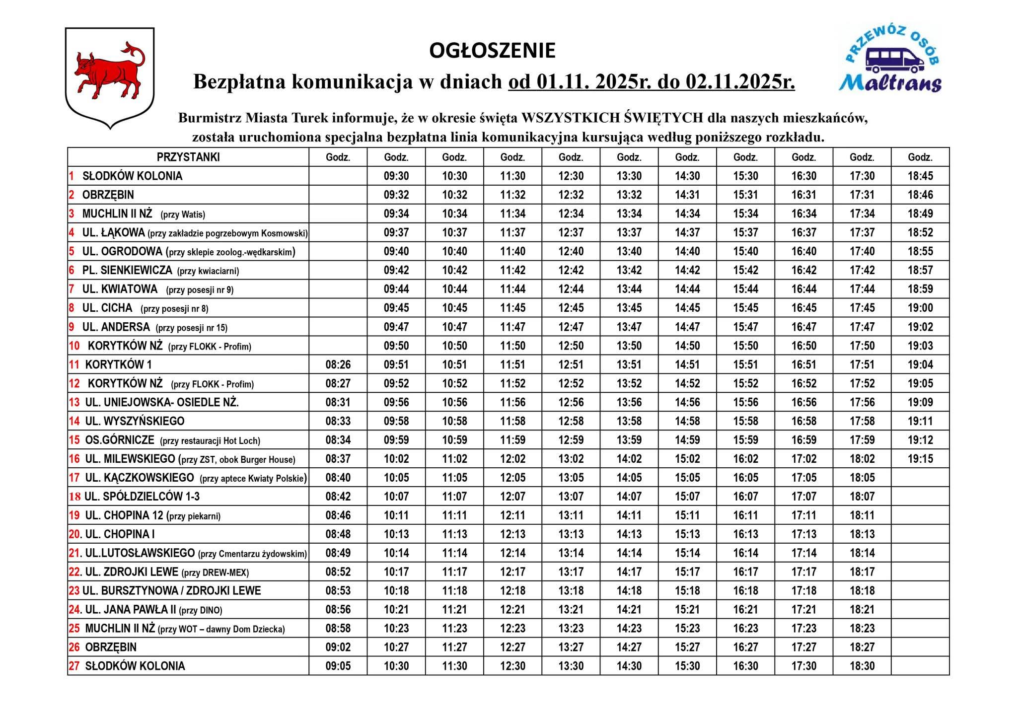 W dniach 1 i 2 listopada 2025 roku mieszkańcy Turku będą mogli skorzystać z bezpłatnej komunikacji miejskiej, która dowiezie ich w okolice cmentarzy w Turku i Słodkowie Kolonii. To udogodnienie przygotowane przez Urząd Miejski w Turku, by ułatwić mieszkańcom bezpieczne i wygodne odwiedzanie grobów bliskich.