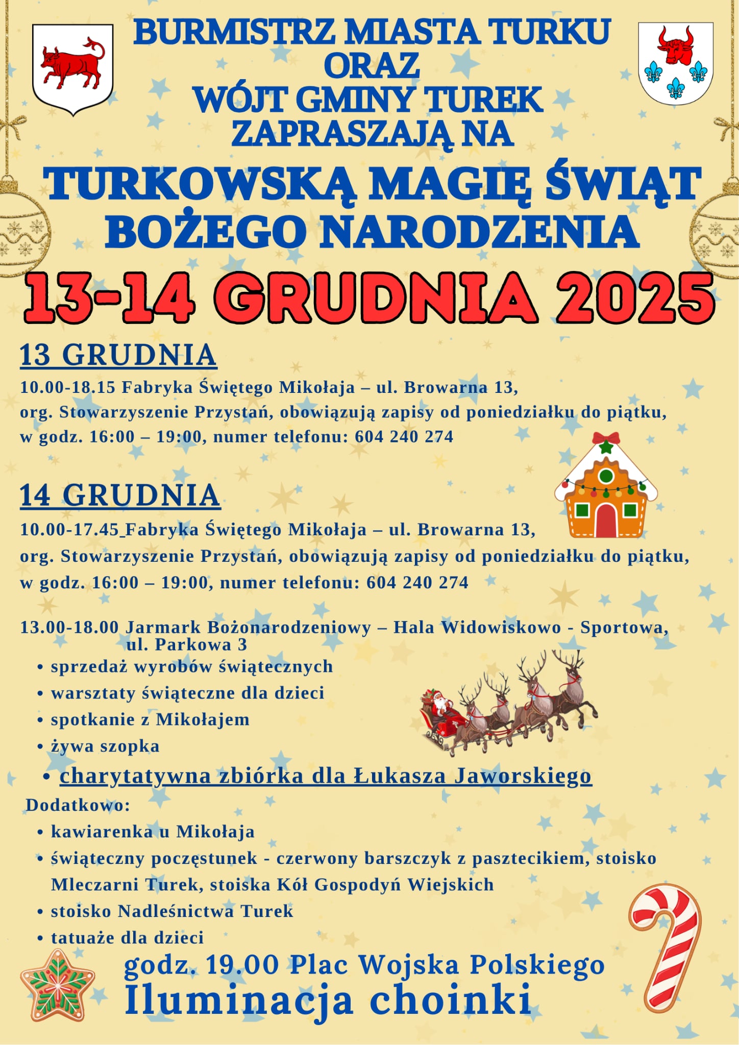 W niedzielę 14 grudnia hala widowiskowo-sportowa przy ul. Parkowej zamieni się w przestrzeń pełną stoisk rękodzielniczych, warsztatów, dekoracji i spotkań. W programie znalazły się m.in. zbiórka charytatywna dla Łukasza Jaworskiego, kawiarenka Świętego Mikołaja, żywa szopka oraz prezentacje lokalnych artystów. Odwiedzający będą mogli spróbować świątecznego barszczu z pasztecikiem, odwiedzić stoiska Kół Gospodyń Wiejskich, Mleczarni Turek czy Nadleśnictwa Turek, a najmłodsi skorzystają z tatuaży brokatowych i warsztatów plastycznych.