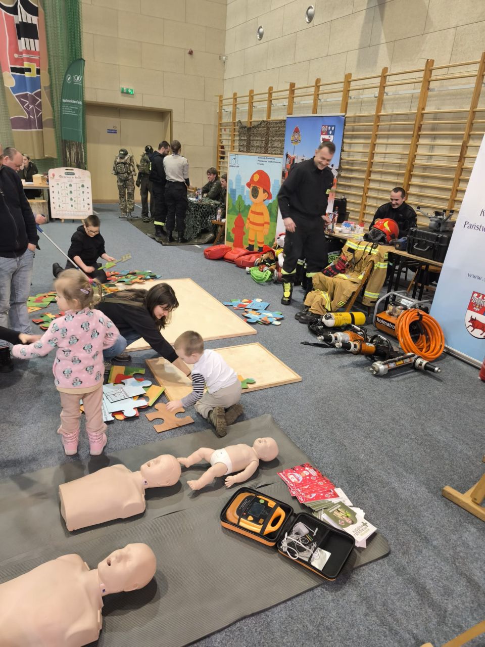 Strażacy zaprezentowali wyposażenie ratownicze wykorzystywane na co dzień podczas działań operacyjnych. Dużym zainteresowaniem cieszył się sprzęt znany dzieciom z zajęć prowadzonych w Sali Ognik, który można było obejrzeć z bliska i sprawdzić w praktyce.