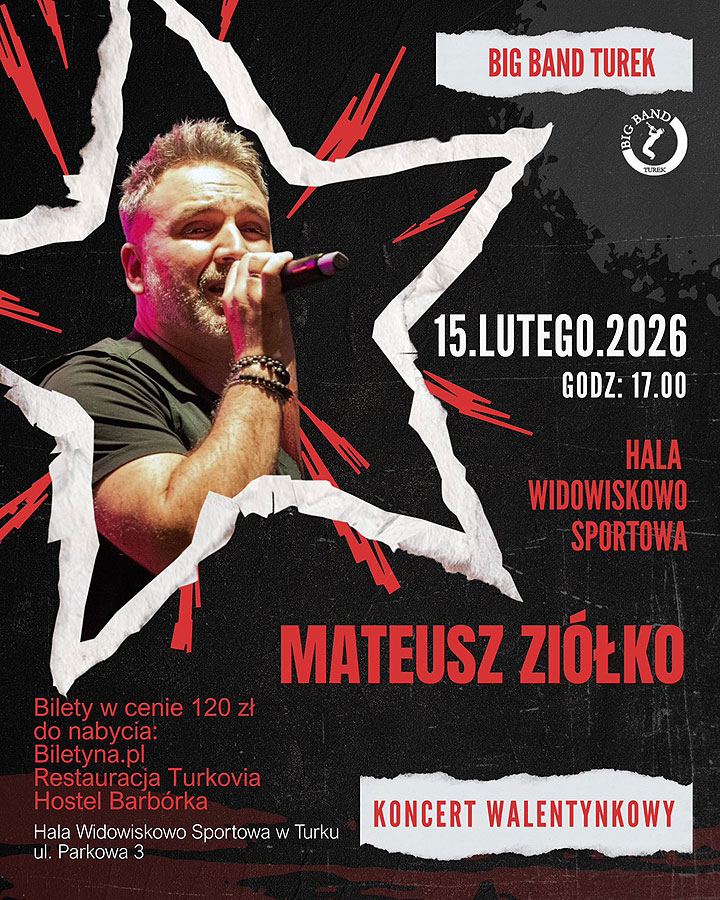 Walentynkowy weekend w Turku zakończy się koncertem z dużym rozmachem. 15 lutego 2026 roku o godz. 17:00 w Hali Widowiskowo-Sportowej przy ul. Parkowej 3 na jednej scenie wystąpią Big Band Turek oraz Mateusz Ziółko. Organizatorzy zapowiadają wydarzenie o wyraźnym koncertowym charakterze, oparte w całości na muzyce wykonywanej na żywo.