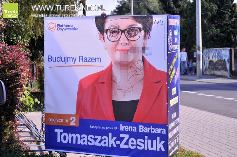 Wandale, bo inaczej osób niszczących plakaty i bilbordy wyborcze nazwać nie można, szczególnie upodobali sobie materiały wyborcze Ireny Tomaszak-Zesiuk. Część bilbordów skrupulatnie pocięli, do tego stopnia, iż z jednego pozostały zaledwie elementy mocujące. Na innym natomiast domalowali kandydatce intymne części męskiego ciała. Z kolei banery posłanki wywieszone na ul. Chopina zostały spalone. W sumie zdewastowano ok. 7-8 banerów.