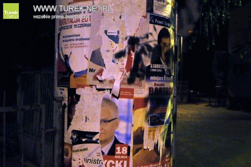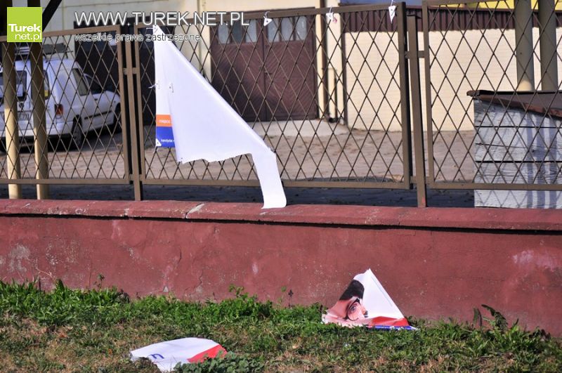 Jeśli zauważyliście w okolicy podobne uszkodzenia plakatów bądź bilbordów wyborczych, zróbcie zdjęcie i prześlijcie na adres redakcja@turek.net.pl Przypomnijmy, że osoby, które zostaną przyłapane na tego rodzaju wandalizmie odpowiedzą za popełnienie wykroczenia z art. 67. § 1. (82) Kto umyślnie uszkadza lub usuwa ogłoszenie wystawione publicznie przez instytucję państwową, samorządową albo organizację społeczną lub też w inny sposób umyślnie uniemożliwia zaznajomienie się z takim ogłoszenie podlega karze aresztu albo grzywny.