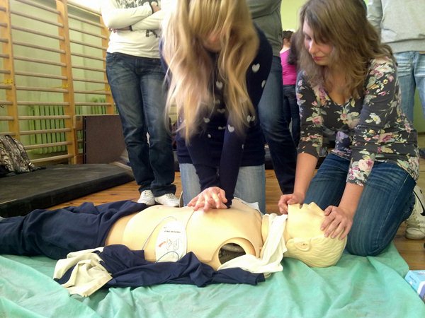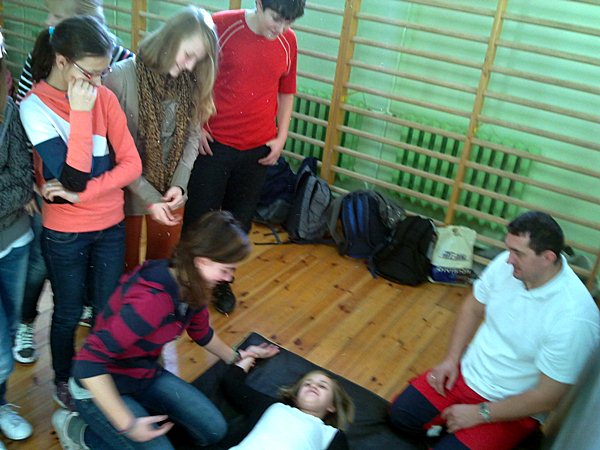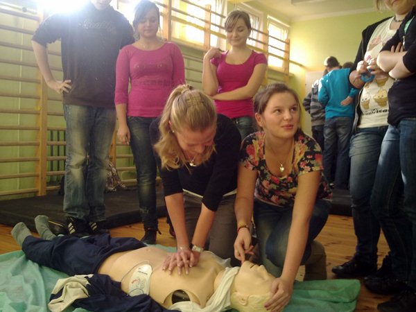 Ratownicy najpierw poinstruowali uczniów, jak ułożyć chorego, rannego w pozycji bezpiecznej oraz w jaki sposób wykonać masaż serca. Następnie pokazali na fantomie, jak w praktyce przeprowadzić poszczególne czynności. Później uczniowie ćwiczyli pozycję bezpieczną, układając kolegów w sposób odpowiedni do stanu zagrożenia życia, oraz wykonywali masaż serca - już na fantomach.