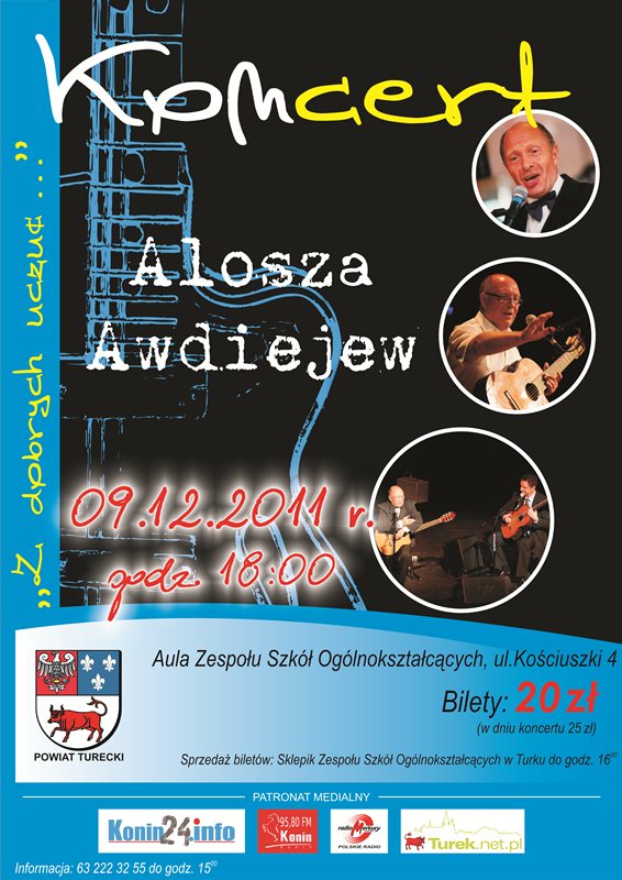 Bilety na koncert Aloszy Awdiejewa dostępne są w sklepiku Zespołu Szkół Ogólnokształcących w Turku, w cenie 20 zł (w dniu koncertu 25 zł). Więcej informacji na temat wydarzenia można uzyskać pod nr tel. 63 222 32 55 oraz w Starostwie Powiatowym w Turku, Wydział Edukacji pok. 220.