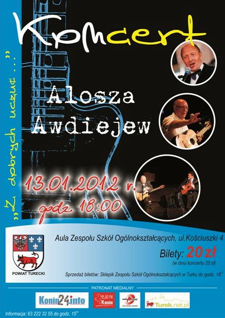 Choć grudniowy koncert artysty nie doszedł do skutku, to jednak „co się dowlecze, to nie uciecze”. Aleksy „Alosza” Awdiejew pojawi się w auli Zespołu Szkół Ogólnokształcących w Turku już 13 stycznia.