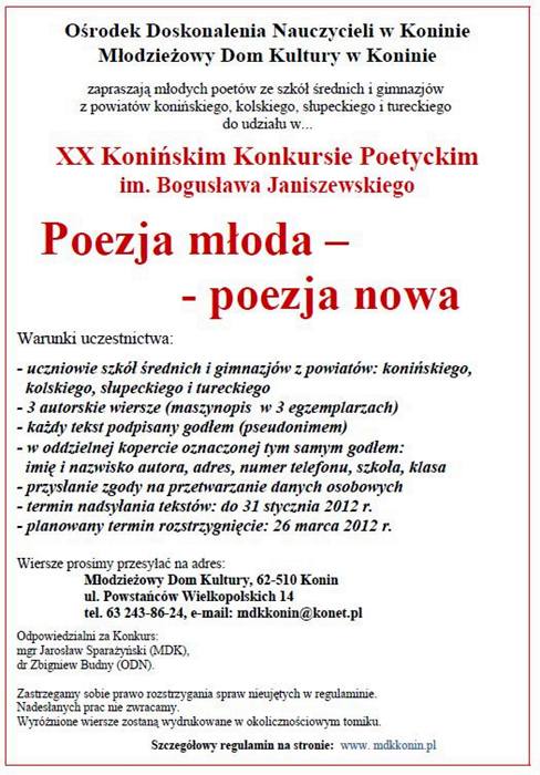 Wszyscy skrywający w szufladach i na dyskach komputerów swą twórczość powinni wziąć udział w XX Konińskim Konkursie Poetyckim im. Bogusława Janiszewskiego – "Poezja młoda - poezja nowa". Najlepsze teksty znajdą się w okolicznościowym tomiku.