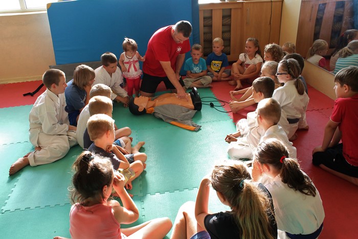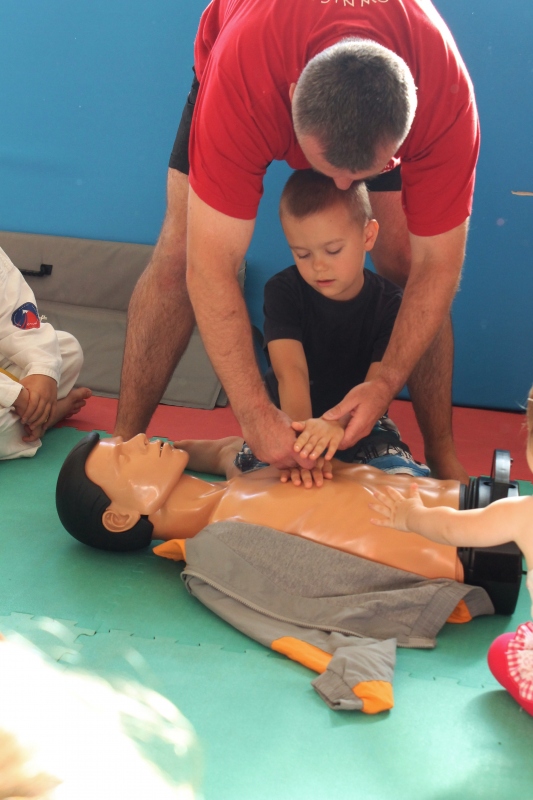 Spotkanie w sali Turkowskiego Klubu Karate OYAMA przy ul. Powstańców Wielkopolskich odbywało się pod hasłem gimnastyki i szeregu zabaw ruchowych z elementami karate. Dodatkowo ratownik medyczny przeprowadził pogadankę i pokaz z zakresu pierwszej pomocy przedmedycznej, obejmującą tematykę: złamań i zwichnięć kończyn, ran i krwotoków, reanimacji krążeniowo-oddechowej, bezpiecznego ułożenia poszkodowanego oraz postępowania w przypadku oparzeń. Wszystkie dzieci oraz chętni rodzice, mogli skorzystać ze specjalnego fantoma do nauki resuscytacji krążeniowo-oddechowej (reanimacji). Dzieciaki chętnie ćwiczyły prowadzenie reanimacji na manekinie, z ciekawością obserwując wskaźnik kontrolujący jakość wykonywanych ucisków klatki piersiowej. Zajęcia karate dla dzieci i młodzieży oraz pokaz i pogadankę z zakresu pierwszej pomocy medycznej poprowadził instruktor Turkowskiego Klubu Karate sensei Robert Soliński 1 dan, który na co dzień jest oficerem Komendy Miejskiej Państwowej Straży Pożarnej w Koninie oraz posiada uprawnienia ratownika medycznego.