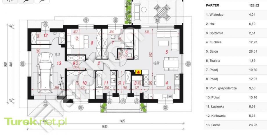 Na parterze znajdziemy Przestronny salon z aneksem kuchennym, 3 oddzielne sypialnie, łazienkę, oddzielne WC, hall, wiatrołap, spiżarnię, garaż i kotłownię.