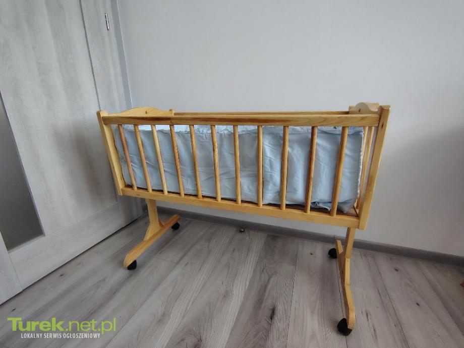 Sprzedam łóżeczko kołyskę drewnianą (nową) z wyposażeniem (materacyk poduszeczka ochraniacz kołderka baldachim)