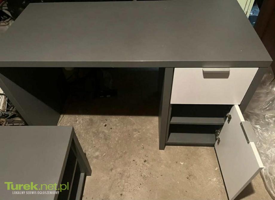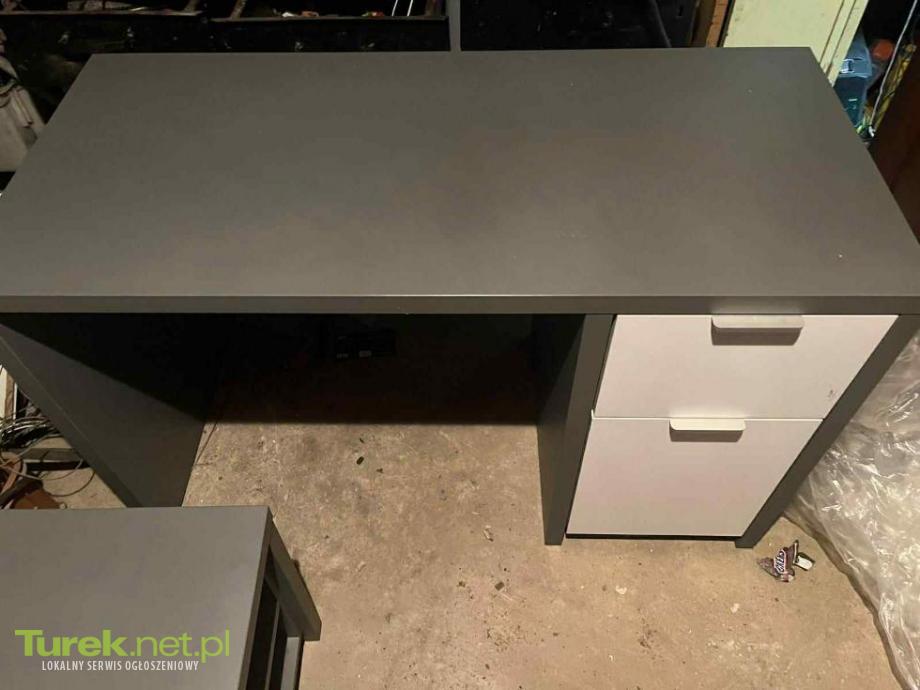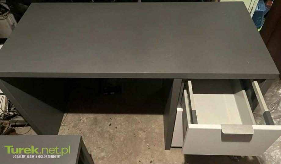 Solidny, szary biurko z szufladami. Biurko jak i rtv były wykonane przez stolarza.